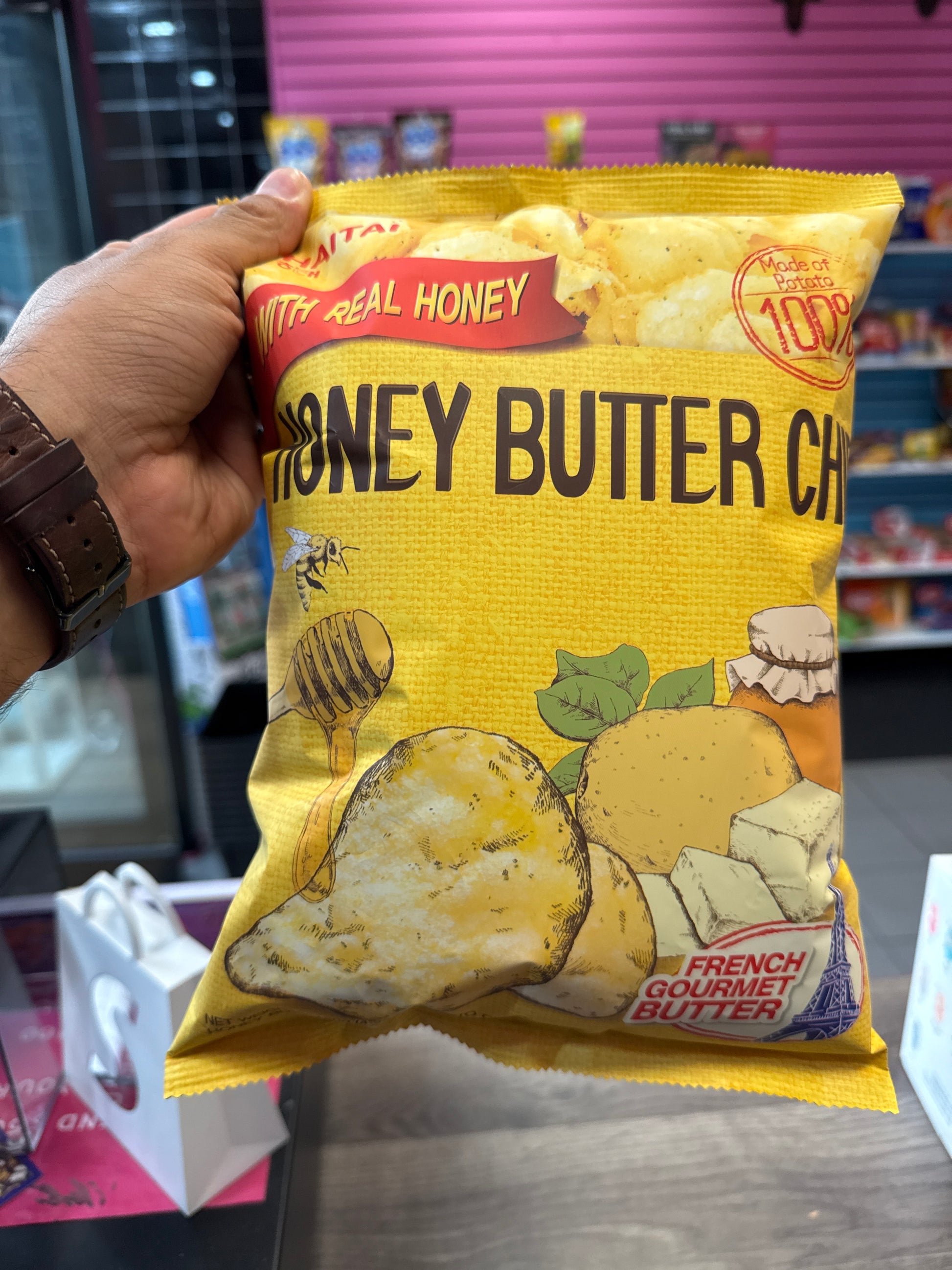 Experience the irresistible combination of sweet and savory with Korean Honey Butter Potato Chips! Each crispy chip is coated with a delectable blend of golden honey and creamy butter, creating a flavor sensation that's both unique and addictively delicious. Whether you're snacking on your own or sharing with friends, these chips are sure to tantalize your taste buds and leave you craving more. Dive into a bag of Korean Honey Butter Potato Chips and discover why they're a favorite snack in Korea!