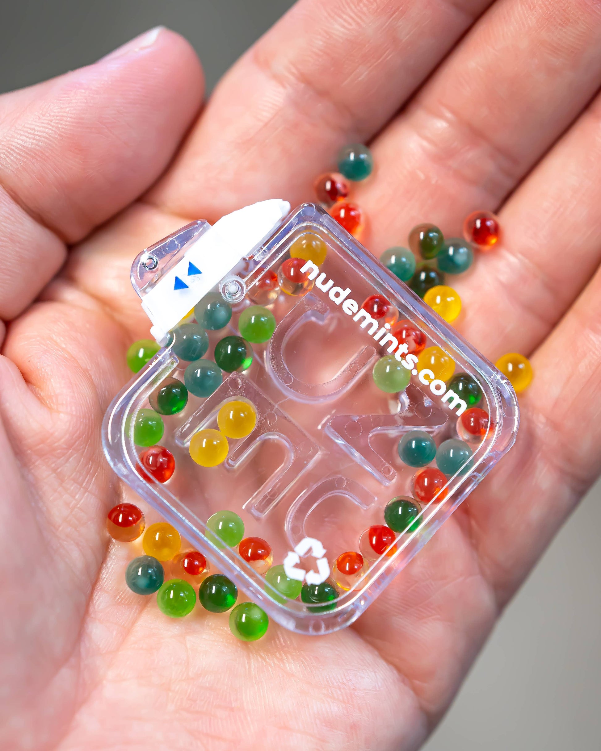 NUDE Mints is a powerful nano-capsule with multiple encapsulated capsules, providing a instant fresh sensation from mouth through your GI tract. It is the only mint that works directly in the gut. One of each of your favorite flavors - Peppermint, Spearmint, Melon, Berry, Grapefruit and Lemon. Enjoy all the flavors in one single container!